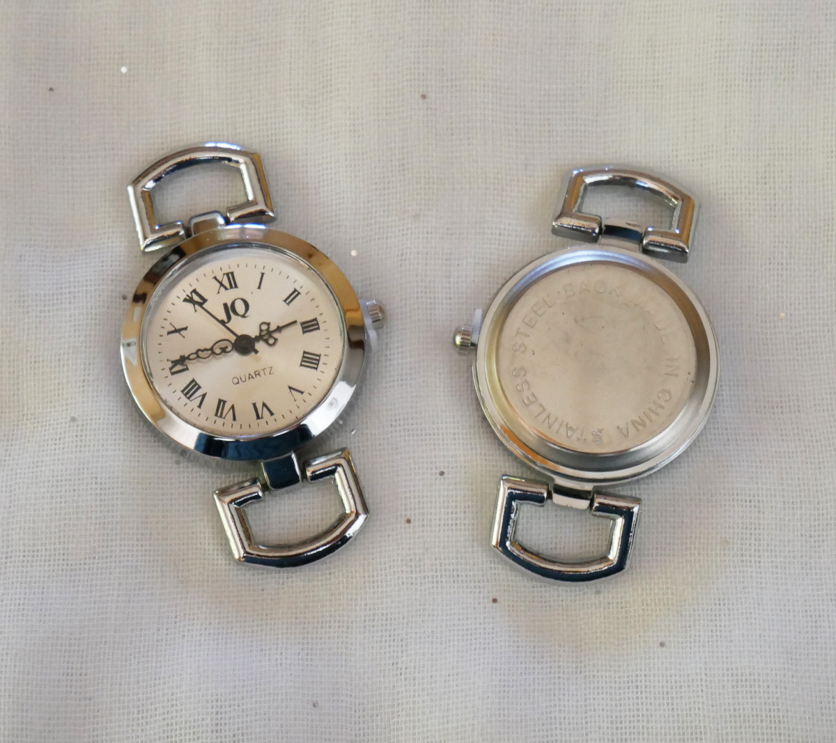 Rund, sølvfarget urskive (diameter 28 mm) med romertall.
