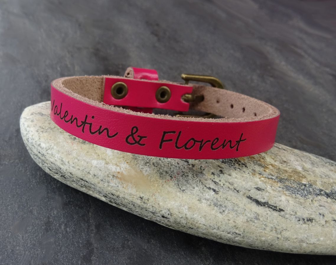 Du kan også velge skrifttype og få inngravert på utsiden av armbåndet (synlig side), eller innsiden (for en konfidensiell melding) eller begge sider. Lærarmbåndet er 9 mm bredt, det lukkes med en fin alderen bronsespenne og en lærsløyfe, og passer til et håndledd mellom 14 cm og 19,5 cm (hvis nødvendig, for et håndledd mindre enn 14 cm (for eksempel for et barn), fortell meg håndleddet ditt slik at jeg kan legge til hull).