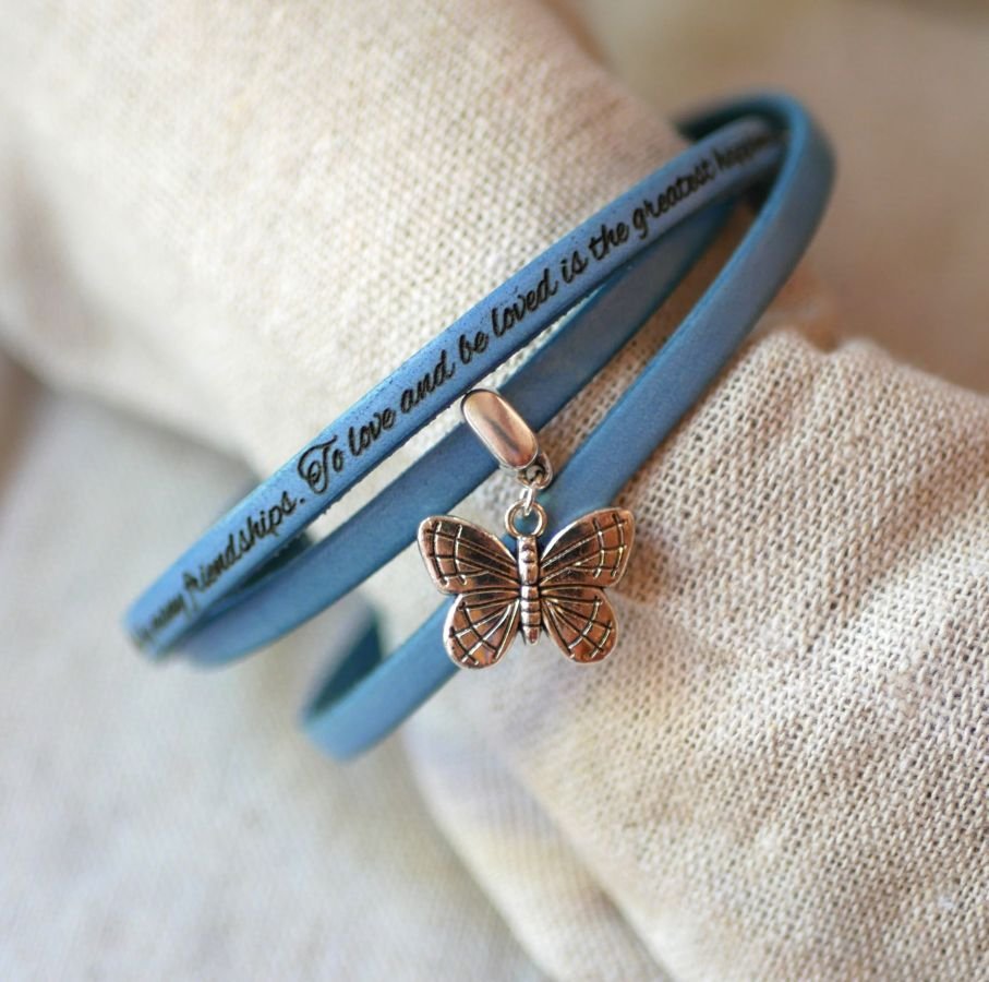 Velg fargen på læret du liker. Vær oppmerksom på at gravering på mørke skinnfarger (som svart, mørk brun) er veldig diskret. Angi en melding som skal graveres (på utsiden og / eller innsiden av armbåndet eller på hver side) med valg av skrifttype. Gravering av små symboler er mulig som et hjerte, uendelighetstegnet, en musikknote ... (skal angis i parentes i teksten som skal graveres). Graveringen er selvfølgelig liten og fin på dette armbåndet på bare 5 mm bredt. Velg også gaveinnpakningen for et armbånd klar til å tilby. Andre armbånd med større lær finnes også i denne butikken.