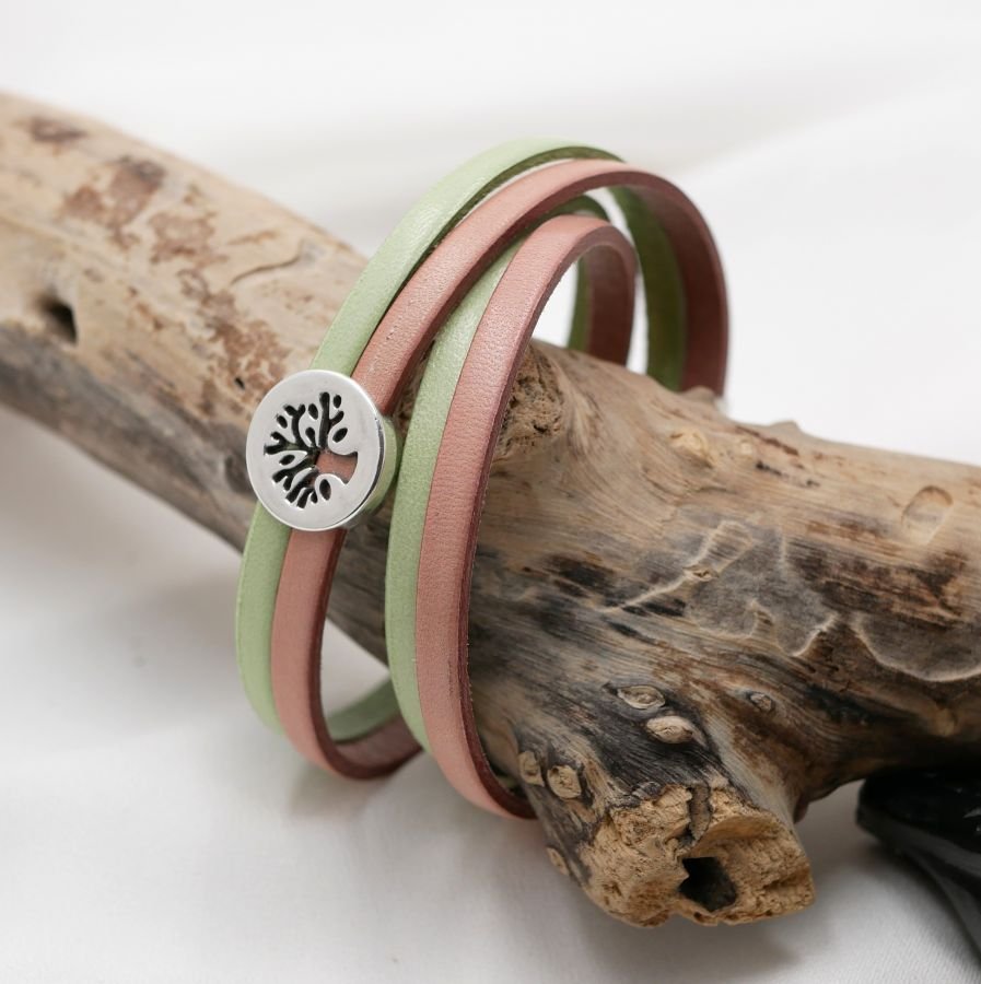 Armbånd med sin fine lærduo i dobbel sving på håndleddet dekorert med en uthulet sølv cabochon symbol Tree of Life. Kan personaliseres hvis du ønsker det med et fornavn, søte ord eller et kort sitat som lasergraveres i læret. Velg å gravere utsiden av hvert lær, innsiden eller begge sider. En flott gaveide for kvinner til jul! Læret er av veldig god kvalitet, europeisk produsert, 5 mm bredt, med et fint utvalg av trendy farger: velg det paret du liker!