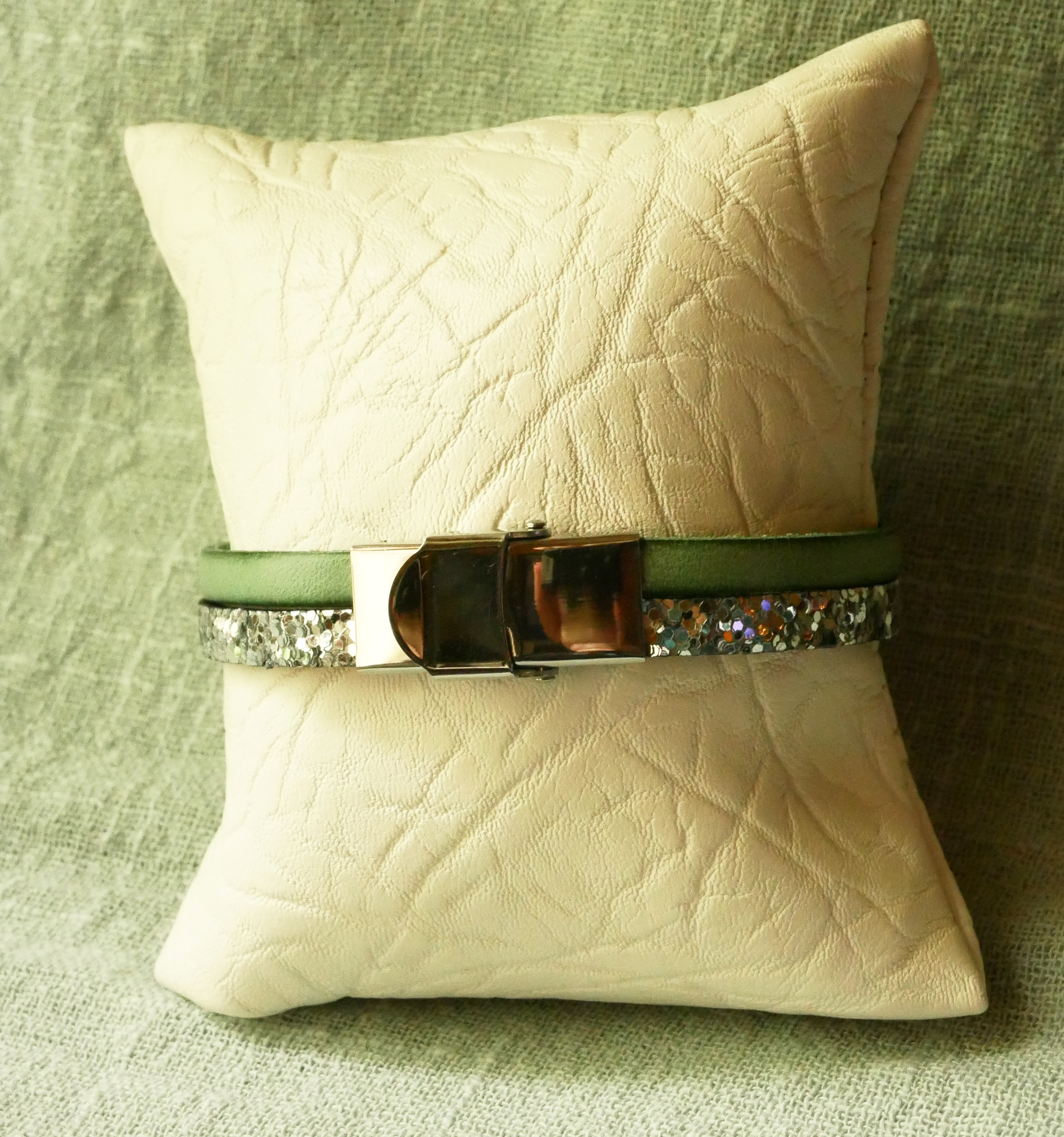 Glitrende damearmbånd med en duo av fint skinn, det ene med sølvglitter og det andre i den fargen du ønsker.