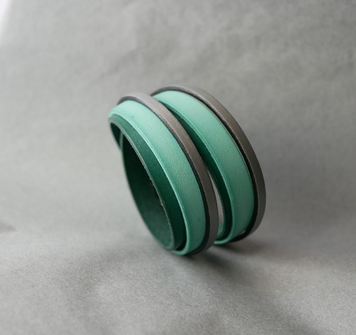 Damearmbånd i lær med 3 forskjellige lærsnører i grønne og sølvfargede nyanser. Dette smykket kan gjøres personlig ved å gravere en liten tekst, fornavn osv. på den synlige siden av armbåndet eller på innsiden som en hemmelig beskjed.