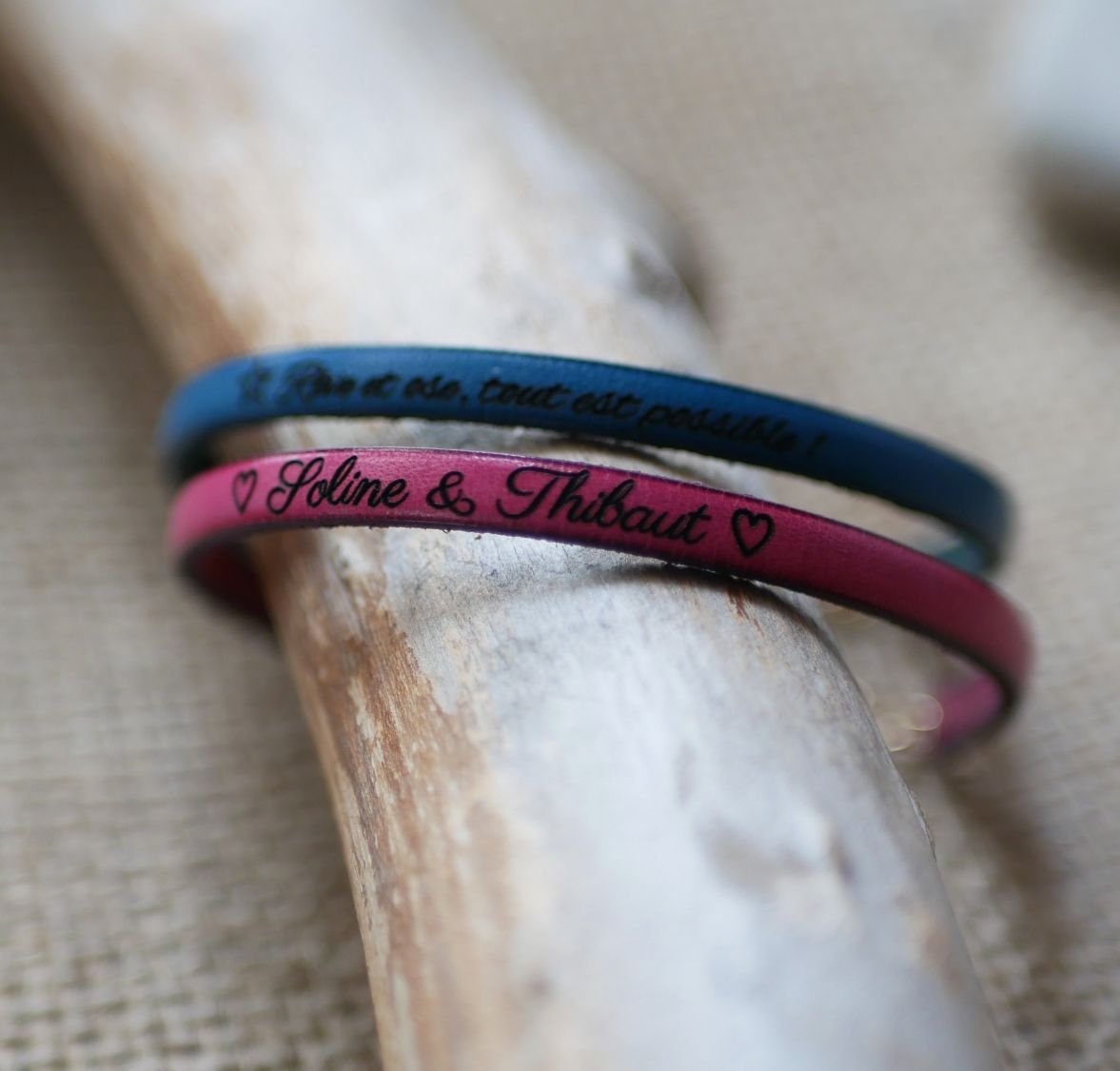 Velg den skinnfargen du liker. Merk at gravering på mørke skinnfarger (som svart, mørk brun) er veldig diskret. Angi meldingen som skal graveres (fornavn, sangtekster, kjærlighetsord ...) med valg av skrifttype. Gravering av små symboler er mulig som et hjerte, uendelighetstegnet, en musikknote ... (skal angis i parentes i teksten som skal graveres). Graveringen er selvfølgelig liten og fin på dette armbåndet på bare 5 mm bredt. Velg også gaveinnpakningen for et armbånd klar til å tilby.