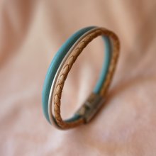Bracelet manchette femme aux 3 cuirs turquoise et argenté fermoir à extension