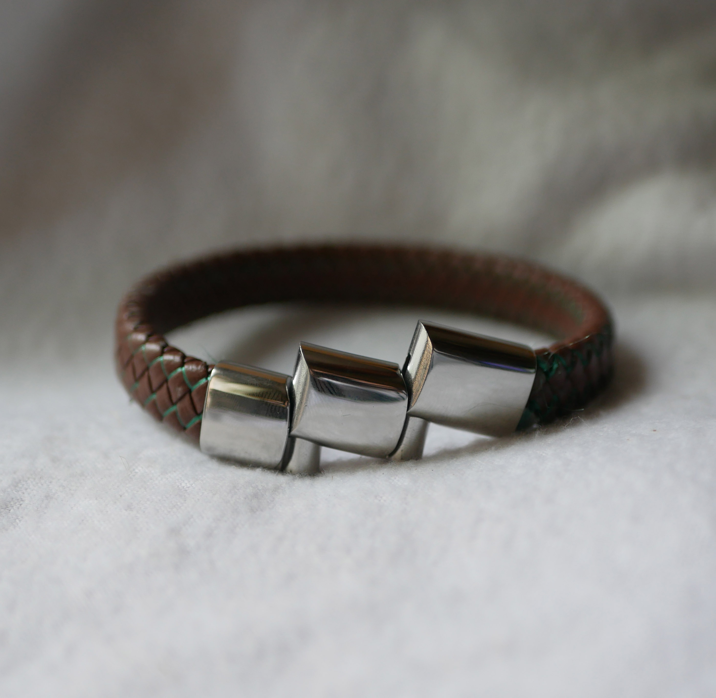 Et enkelt og elegant svart flettet lærarmbånd med en bred stropp og en vakker magnetisk glidelås i børstet stål. Lærdimensjoner: bredde 12 mm og tykkelse 6 mm. Armbåndet er laget for et gjennomsnittlig manns håndledd på 18 cm, noe som gir en total lengde på 19,5 cm.