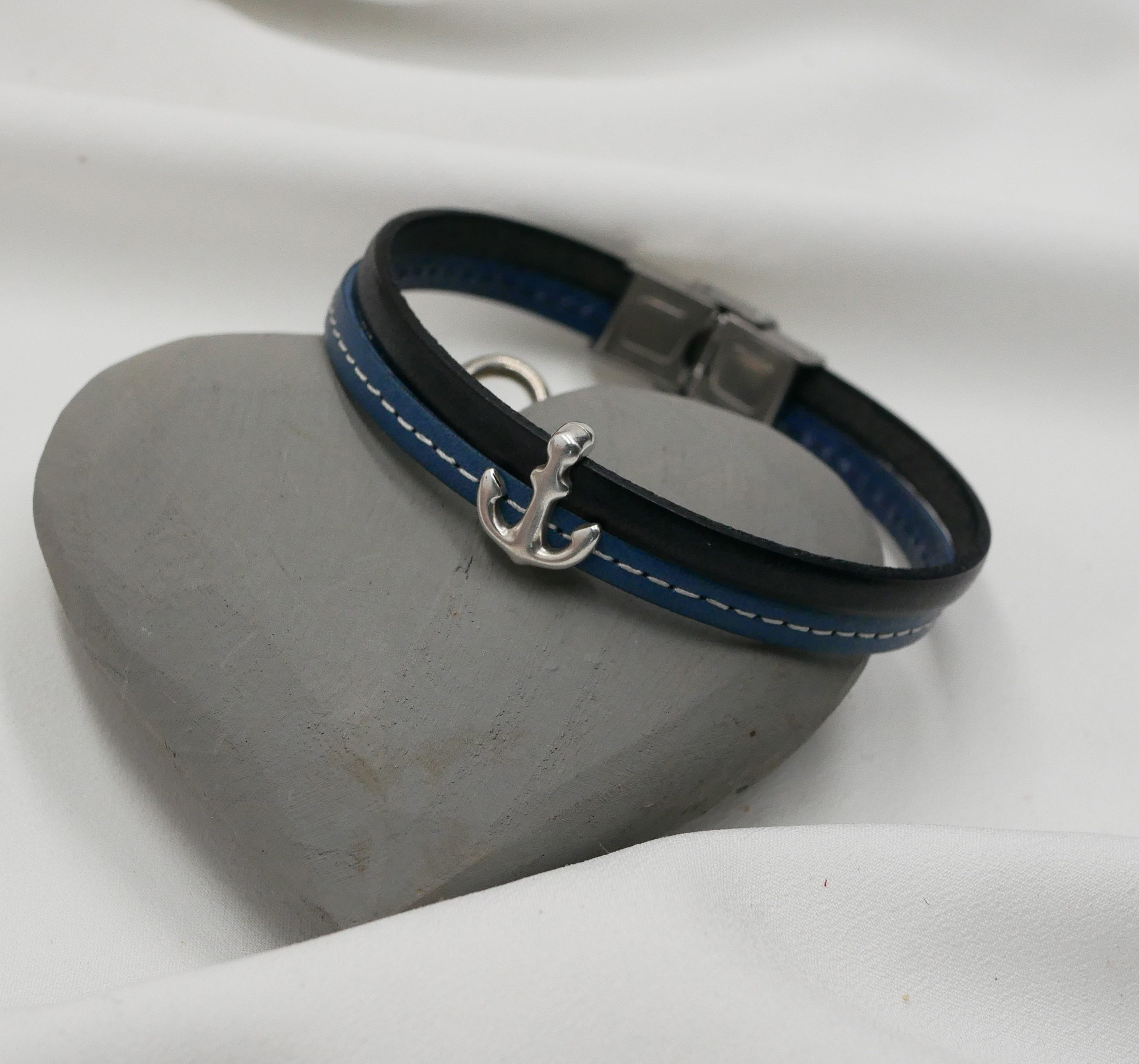 Originalt armbånd med marin ankerdekorasjon, med 2 lær, det ene blått med bannersøm, det andre i den fargen du ønsker, og som kan graveres med et budskap, navn som kan tilpasses hvis du ønsker det med fornavn, vennlige ord, GPS-koordinater eller et kort sitat som lasergraveres i læret.