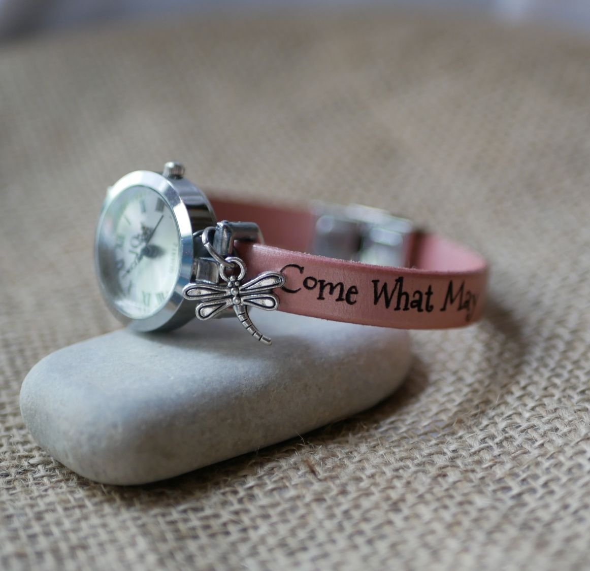 Tilpass denne klokken ved å velge farge på læret og ved å velge å gravere en personlig, unik melding på remmen (synlig side eller innsiden): en kort tekst på 20 tegn vil bli gravert etter urskiven. Gravering på mørkt eller svart skinn er veldig diskret og er tydelig synlig på lyse farger. Initialer, fornavn, dato, symboler (som et hjerte, uendelig ...) kan graveres. Du kan også velge skrifttype (ellers skrifttype nr. 7 som standard). For å holde lærarmbåndet ditt i lang tid, ikke få det vått.