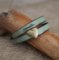 Lærarmbånd i valgfri farge med dobbel vikling rundt håndleddet, som kan tilpasses ved å gravere et valgfritt budskap og dekoreres med en aldret hjerteformet trykknapp i bronse. Armbåndet lukkes med en elegant magnetlås i antikk gull med en krok. Hjertet er 15 mm høyt.